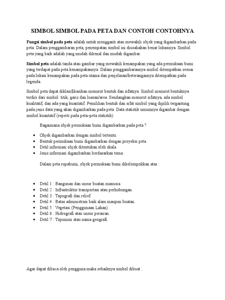 Kebijakan satu peta menuntut percepatan dalam pemenuhan informasi geospasial dasar (igd) sebagai referensi tunggal dalam penyelenggaraan pengaturan simbol peta rbi skala 1:50.000 untuk tampilan kartografi dituangkan dalam standar nasional indonesia (sni) 6502.3:2010 tentang. Simbol peta merupakan tanda / gambar yang mewakili kenampakan yang terdapat di permukaan bumi yang ada pada peta kenampakannya. Mereka melihat sebuah denah peta di dalam kertas yang mereka baca. Ada beberapa simbol dalam peta, ucap roro dengan semangat. Dalam penggambarannya simbol ditempatkan sesuai pada lokasi kenampakan pada peta utama dan penjelasan/keterangannya ditempatkan pada legenda. Simbol didalam peta yaitu bentuk ataupun tanda yang melambangkan penjelasan tertentu pada suastu peta. Sebenarnya simbol garis ini masih banyak lagi di dalam peta, seringkali kita melihat kenampakan gunung yang digambarkan dengan simbol segitiga. Dalam penggambaran peta, penempatan simbol ini diusahakan benar lokasinya. Simbol peta ini digunakan untuk membedakan kenampakan yang dinyatakan dalam bentuk jumlah, seperti tingkat kepadatan. Sebelum membuat peta sebaiknya pelajari dulu spesifikasi ini. Fungsi simbol komponen arti warna kuning merah biru 2. Simbol peta berdasarkan kenampakan lingkungan dibedakan menjadi dua macam yaitu simbol budaya dan alam. Sebuah peta yang ideal harus bisa dibaca dan dipakai dengan mudah.